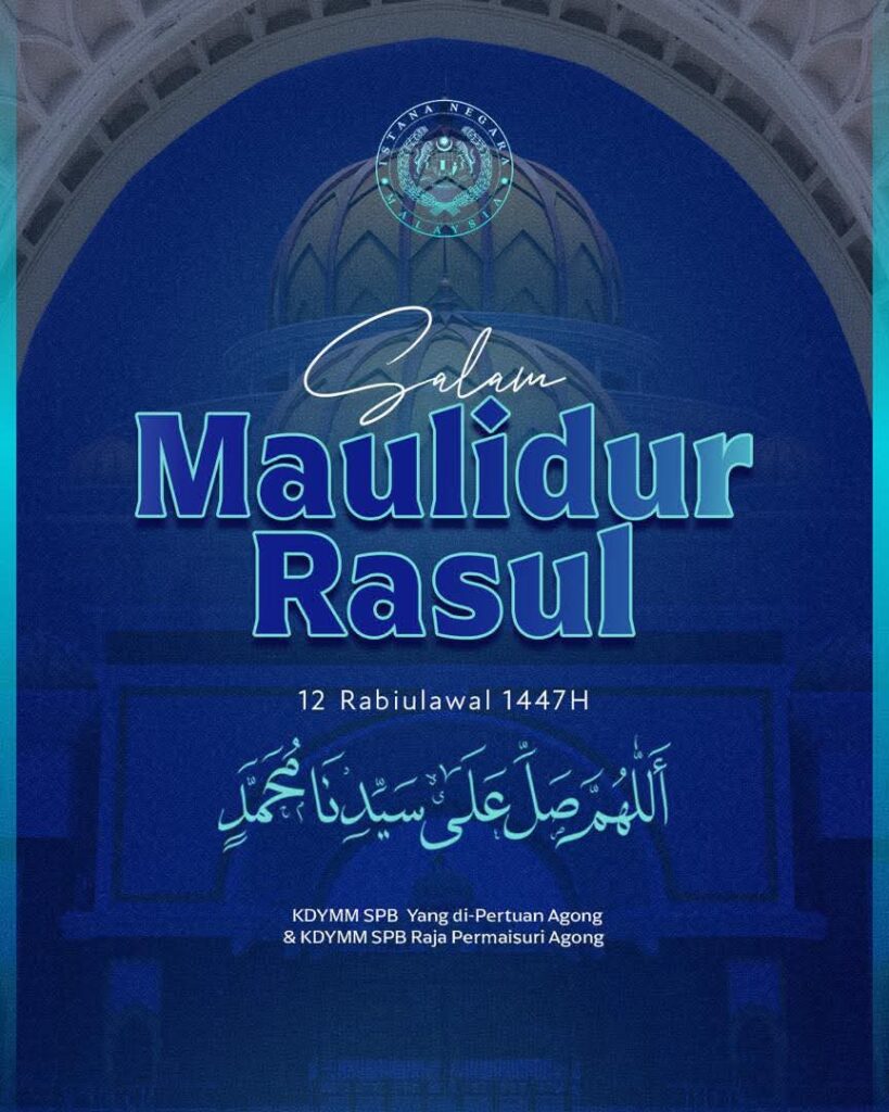 KUALA LUMPUR: Sempena sambutan Maulidur Rasul 1447 Hijrah, Kebawah Duli Yang Maha Mulia Seri Paduka Baginda Yang di-Pertuan Agong, Sultan Ibrahim dan Kebawah Duli Yang Maha Mulia Seri Paduka Baginda Raja Permaisuri Agong, Raja Zarith Sofiah, menzahirkan ucapan penuh makna kepada seluruh rakyat Malaysia.