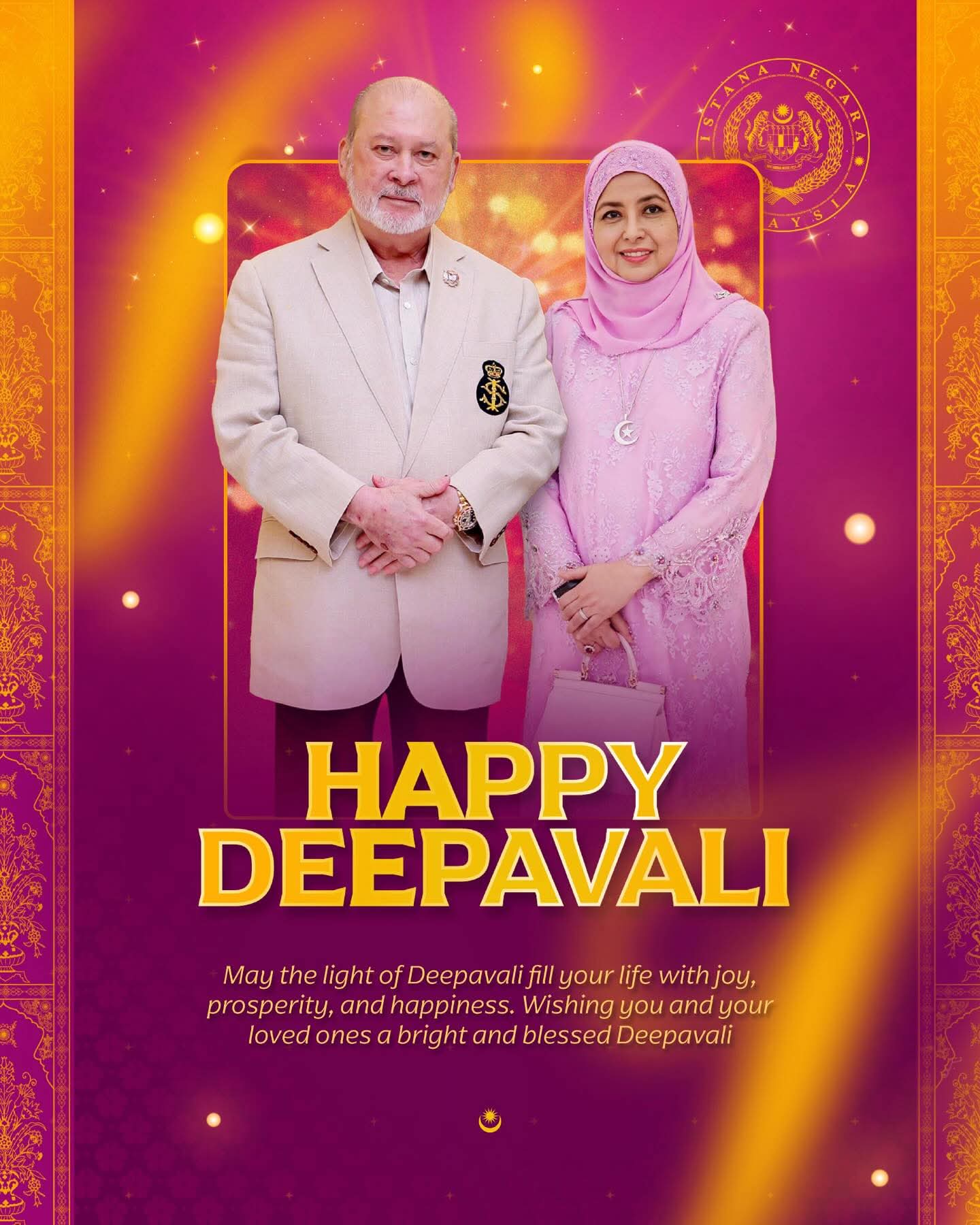 KUALA LUMPUR: Sempena sambutan Deepavali, Yang di-Pertuan Agong Sultan Ibrahim dan Raja Permaisuri Agong Raja Zarith Sofiah menzahirkan ucapan penuh kasih kepada seluruh penganut Hindu di Malaysia.