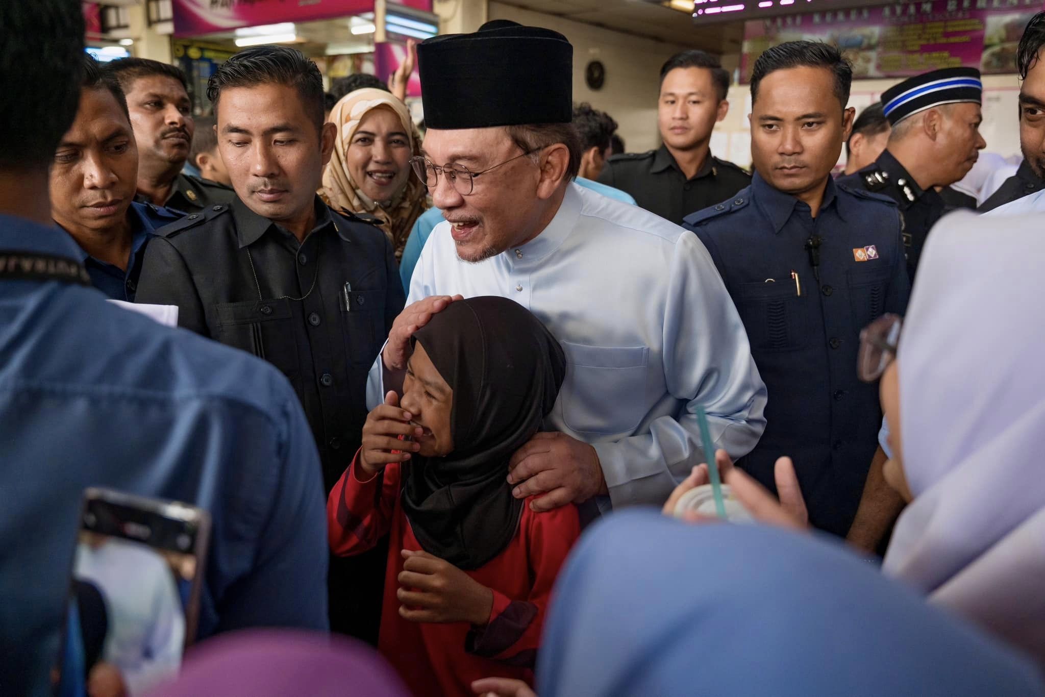 Selain bergambar dan berbual mesra bersama pelajar, Anwar turut menyantuni peniaga dan pengunjung lain di Medan Selera itu.