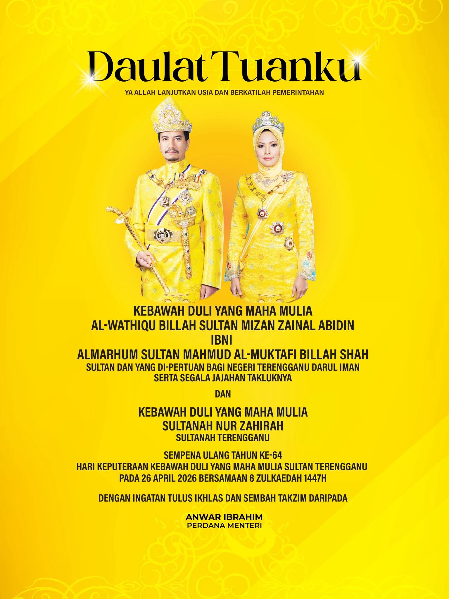 KUALA LUMPUR: Perdana Menteri, Datuk Seri Anwar Ibrahim, menzahirkan ucapan tahniah sempena Sambutan Ulang Tahun Hari Keputeraan Ke-64 Sultan Terengganu, Sultan Mizan Zainal Abidin.