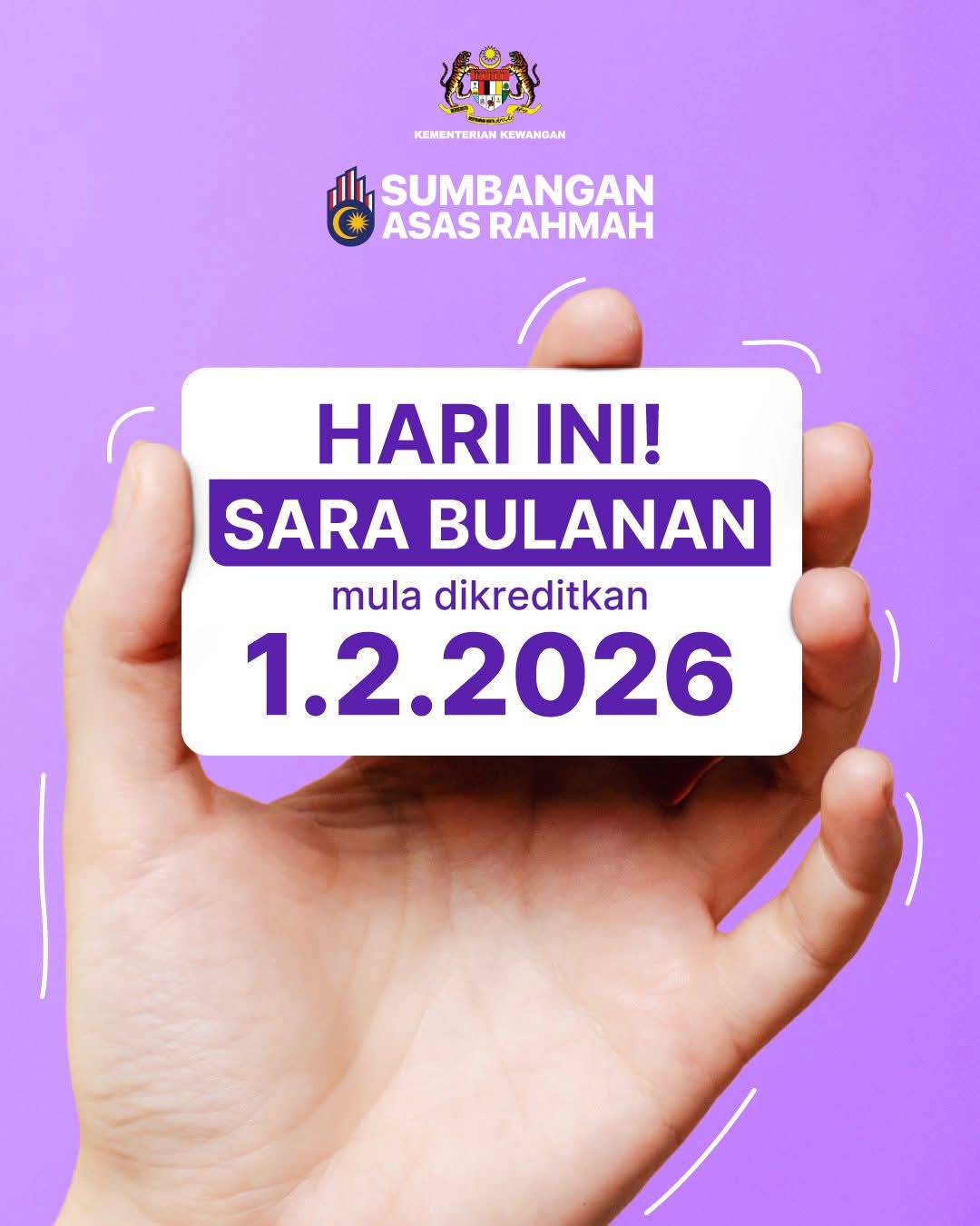 PETALING JAYA: Bantuan Sumbangan Asas Rahmah (SARA) bulanan telah dikreditkan ke dalam MyKad penerima yang layak hari ini (Ahad).