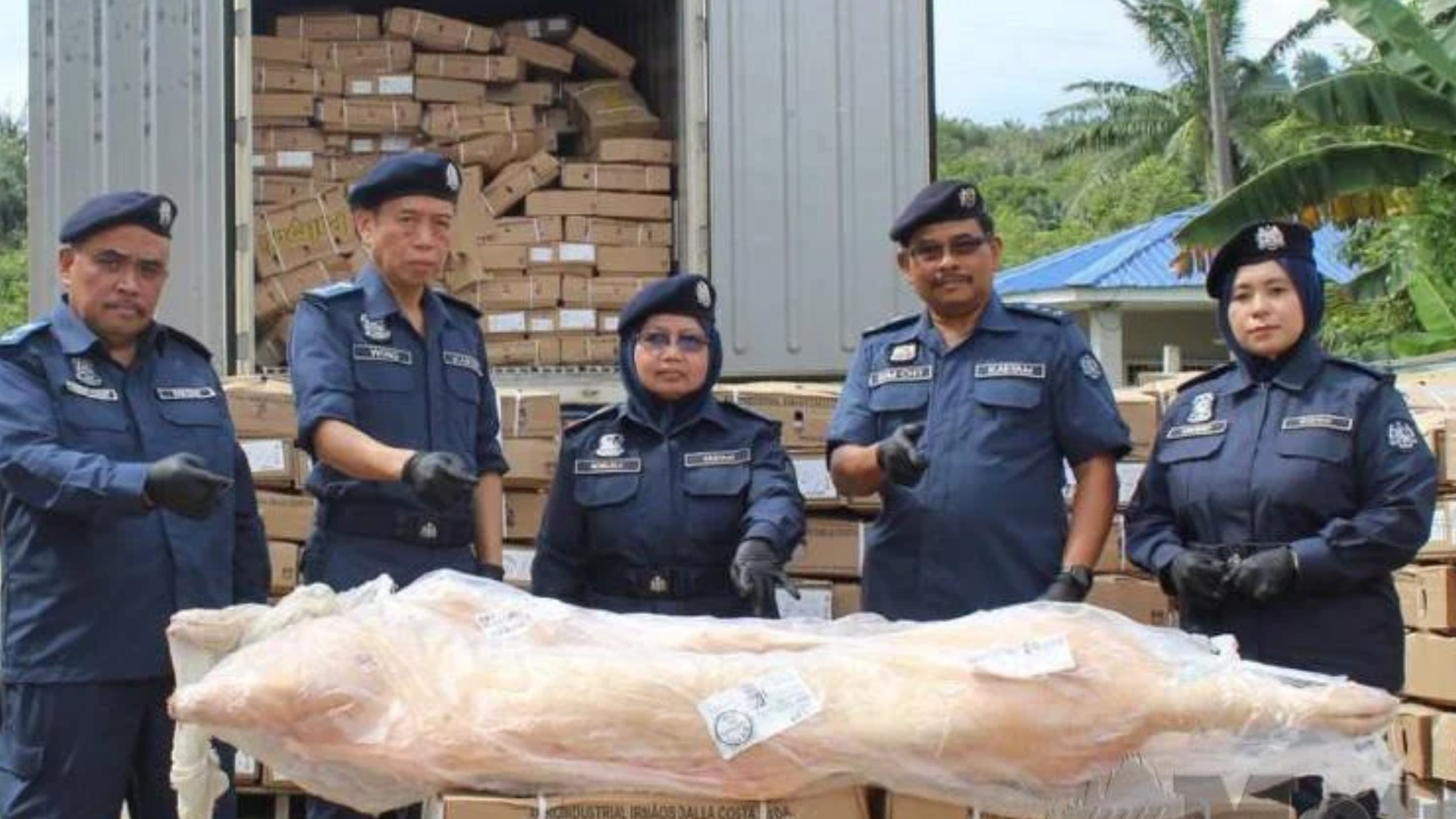 “Pemeriksaan pada tiga kontena sejuk (reefer container) bersama dua pekerja lelaki warga Myanmar menemukan sejumlah dagangan disyaki daging babi sejuk beku berjenama Palmali seberat 85,500 kg dan anggaran nilai RM1.54 juta.