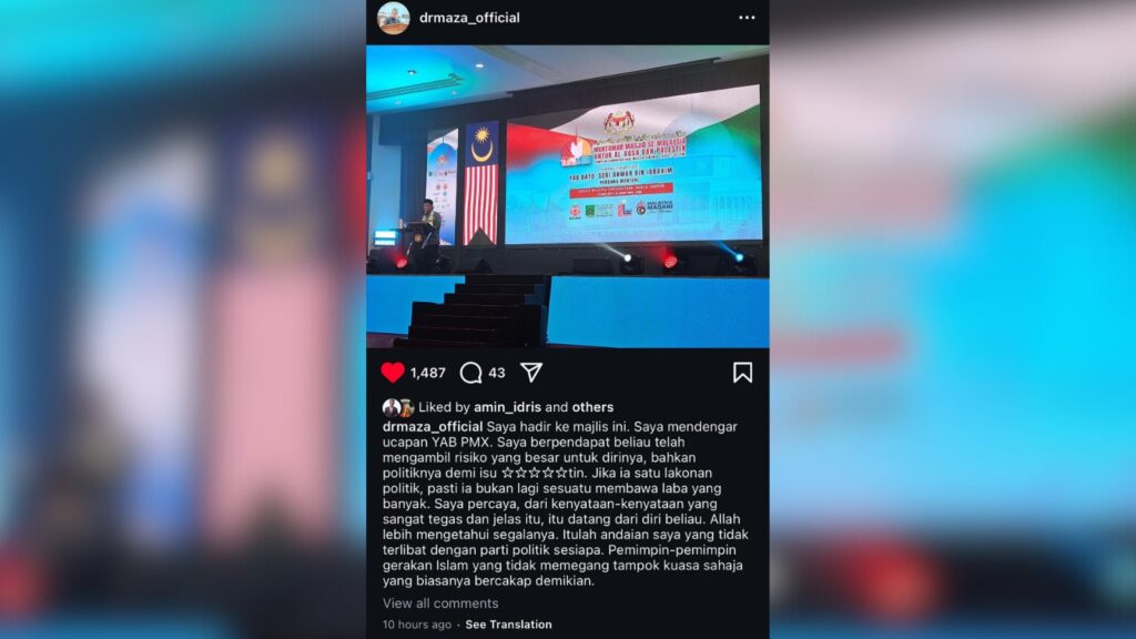 Terdahulu, Dr Maza di laman Instagramnya memuat naik hantaran gambar Datuk Seri Anwar Ibrahim sedang berucap di Muktamar Masjid Se-Malaysia untuk Al-Aqsa dan Palestin lalu menulis bahawa beliau percaya Perdana Menteri itu ikhlas dan bukan berlakon demi perjuangan Palestin.