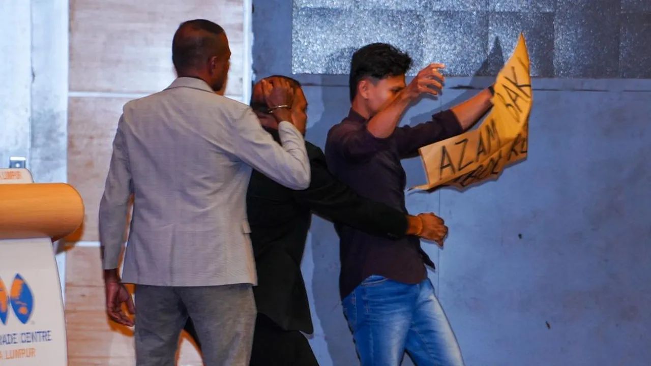 Situasi menjadi kecoh seketika apabila seorang lagi individu muncul dari arah belakang, dengan salah seorang daripada mereka dilihat membawa sepanduk yang menggesa penahanan Azam, dipercayai berkaitan isu pemilikan saham yang pernah dikaitkan dengannya sebelum ini.