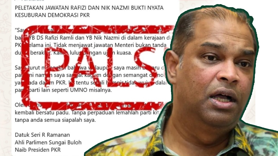 PETALING JAYA: Naib Presiden Parti Keadilan Rakyat (PKR), Datuk R. Ramanan Ramakrishnan, mengecam keras tindakan pihak tidak bertanggungjawab yang menyalahgunakan namanya untuk menyebarkan maklumat palsu berkaitan peletakan jawatan Datuk Seri Rafizi Ramli dan Nik Nazmi Nik Ahmad.
