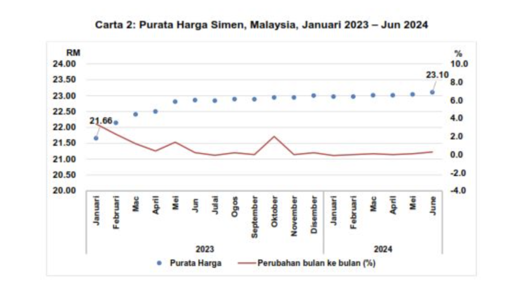 “Perbandingan tahunan untuk tempoh Jun 2023 dan Jun 2024 menunjukkan peningkatan indeks harga seunit simen antara 0.4 peratus hingga 4.7 peratus bagi hampir kesemua kawasan di Malaysia.