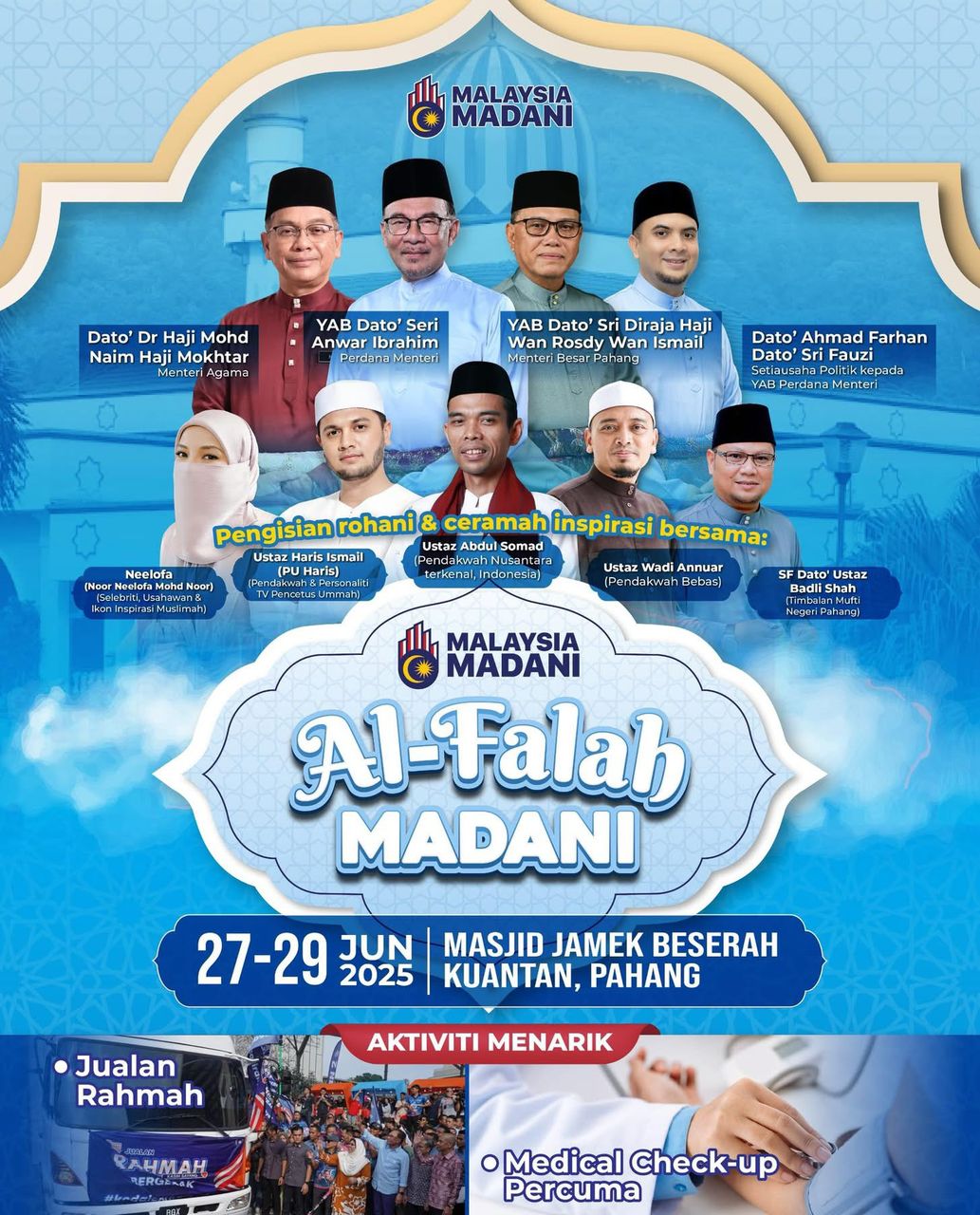KUANTAN: Sempena sambutan Maal Hijrah tahun ini, orang ramai dijemput memeriahkan Karnival Al-Falah MADANI bersama Perdana Menteri, Datuk Seri Anwar Ibrahim. Acara ini akan berlangsung selama tiga hari bermula 27 hingga 29 Jun 2025 di Masjid Beserah, Kuantan. Karnival ini bakal menampilkan tokoh agama terkemuka dari dalam dan luar negara bagi mengisi slot rohani yang … Continue reading Karnival Al-Falah MADANI Bersama PM, Tampil Ustaz Abdul Somad, Wadi Annuar