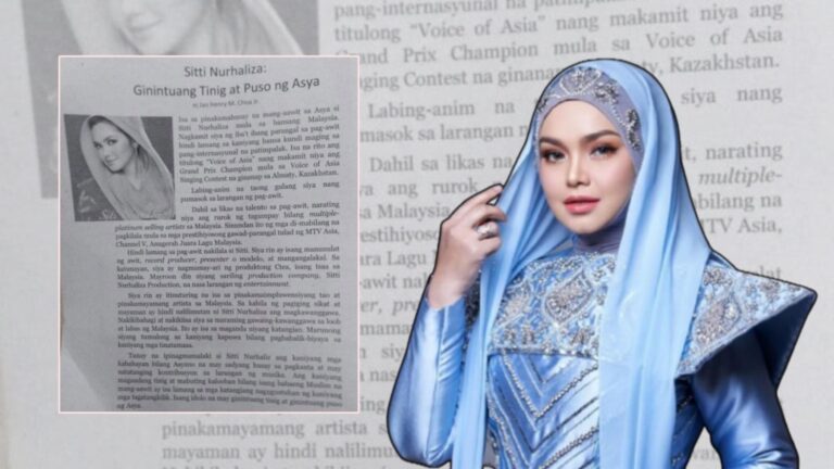 Oleh: Aliyaa Azmi BIDUANITA Negara, Datuk Seri Siti Nurhaliza, sekali lagi mencuri perhatian apabila kisah hidupnya diangkat dalam buku teks sekolah di Filipina, sekali gus meneguhkan kedudukannya sebagai ikon muzik Asia. Perkara itu terbongkar apabila seorang pengguna dipercayai rakyat Filipina meninggalkan komen di laman TikTok Siti Nurhaliza, bertanyakan sama ada penyanyi tersohor itu adalah tokoh … Continue reading Kisah hidup Siti Nurhaliza diabadi dalam buku teks sekolah Filipina