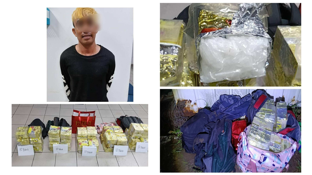 “Hasil pemeriksaan di sebuah pondok di kawasan tersebut, lelaki berkenaan ditahan bersama lima buah beg pelbagai jenama yang berisi bahan disyaki dadah jenis syabu seberat 52.5 kilogram bernilai RM2,100,000.