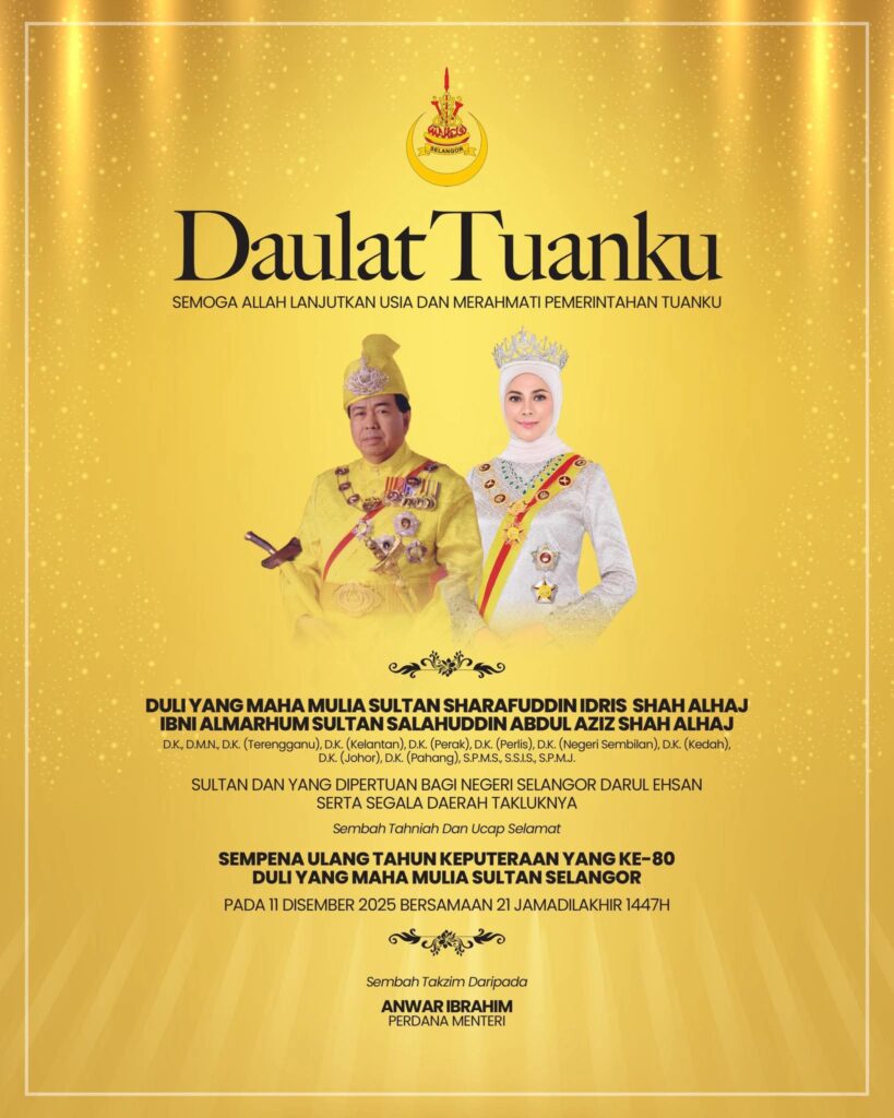 PETALING JAYA: Perdana Menteri, Datuk Seri Anwar Ibrahim, merafak sembah dan menzahirkan setinggi-tinggi tahniah sempena Sambutan Ulang Tahun Hari Keputeraan Ke-80, Duli Yang Maha Mulia Sultan Selangor, Sultan Sharafuddin Idris Shah AlHaj Ibni Almarhum Sultan Salahuddin Abdul Aziz Shah AlHaj.