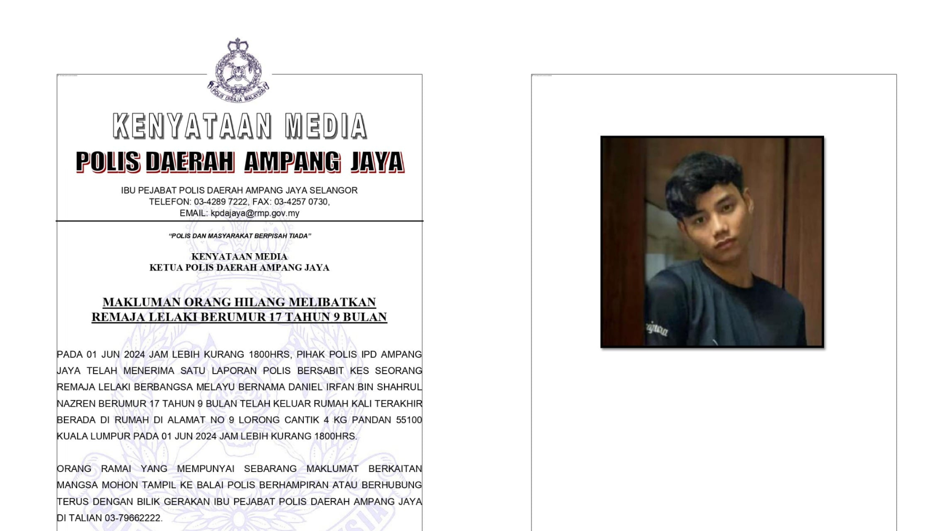 Seorang remaja lelaki dilaporkan hilang selepas kelibatnya dilihat kali terakhir berada di rumah sekitar Kampung Pandan, Kuala Lumpur pada 1 Jun Lalu.