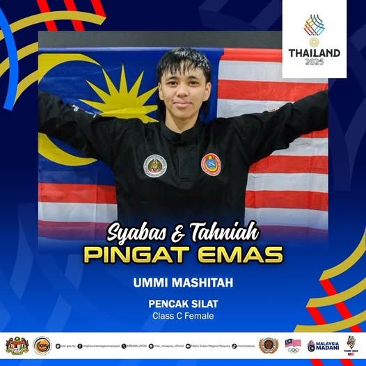 Sementara itu, di Hall 4, Impact Arena, Muang Thong Thani, pesilat wanita negara Ummi Mashitah Hassan turut mencuri tumpuan apabila meraih pingat emas kelas C (55-60kg), sekali gus menghadiahkan emas kedua buat kem silat negara.
