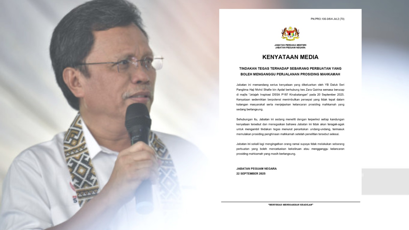 AGC turut mengingatkan orang ramai agar tidak mengeluarkan sebarang kenyataan atau melakukan tindakan yang boleh mencetuskan kekeliruan, prejudis atau gangguan terhadap proses kehakiman yang sedang berjalan.