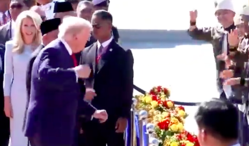 Trump yang turun dari pesawat rasmi Air Force One, jenis Boeing 747-200B berwarna biru putih, dilihat tersenyum lebar sambil mengikut rentak penari dengan gaya santai, mencetuskan sorakan dan tepukan gemuruh daripada orang ramai.