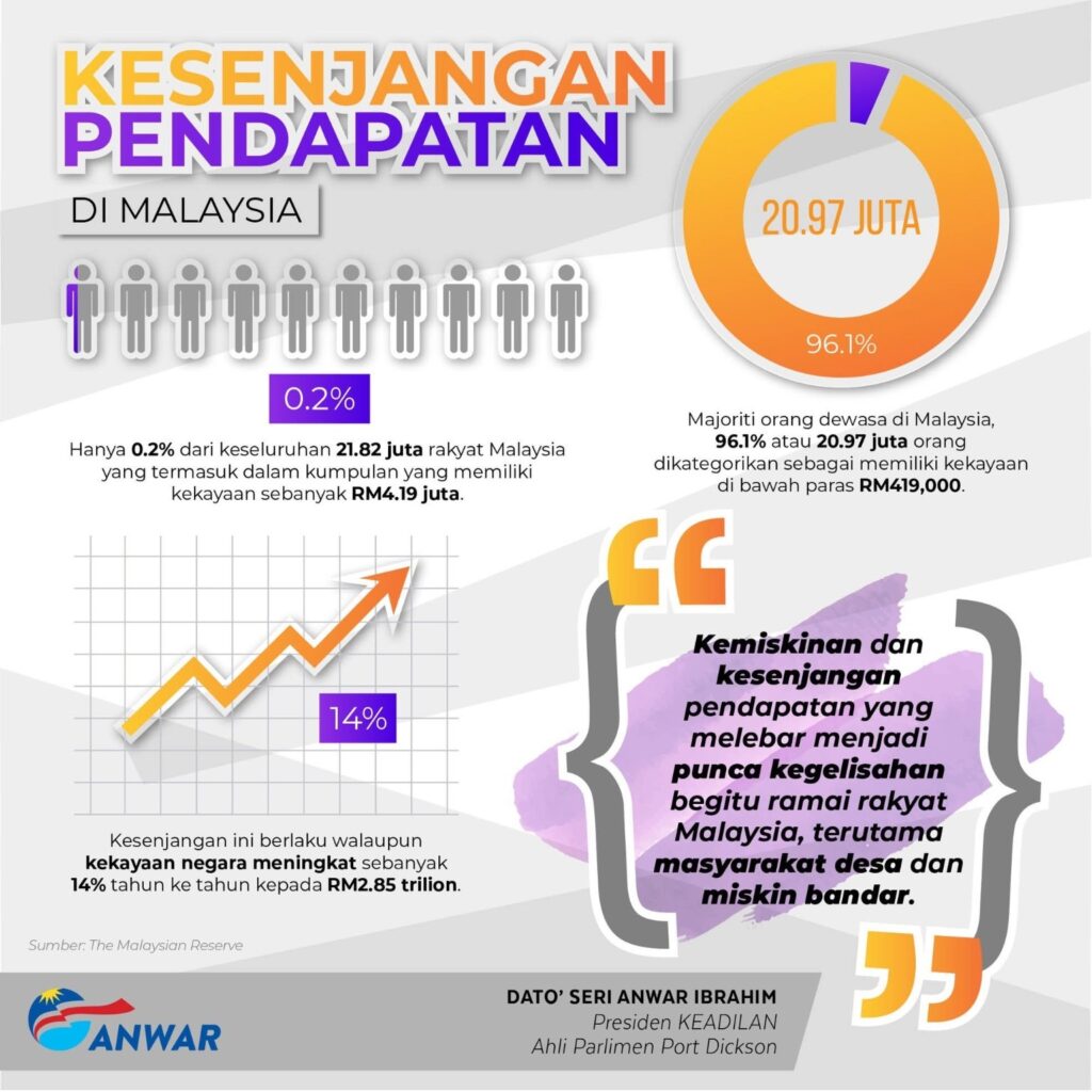 Pada 2019, Datuk Seri Anwar Ibrahim ketika itu Presiden PKR dan Ahli Parlimen Port Dickson pernah berkongsi satu infografik yang menggerunkan: hanya 0.2% rakyat memiliki kekayaan besar, manakala lebih 96% orang dewasa Malaysia hidup jauh di bawah paras kekayaan yang signifikan.