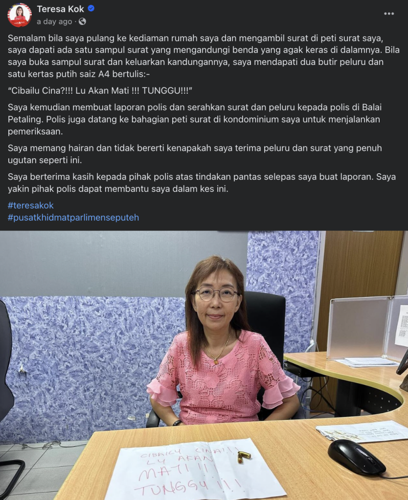Terdahulu, Kok dalam hantaran menerusi Facebook mendakwa beliau menerima ugutan bunuh dalam surat yang dihantar ke rumahnya bersama dua butir peluru hidup.