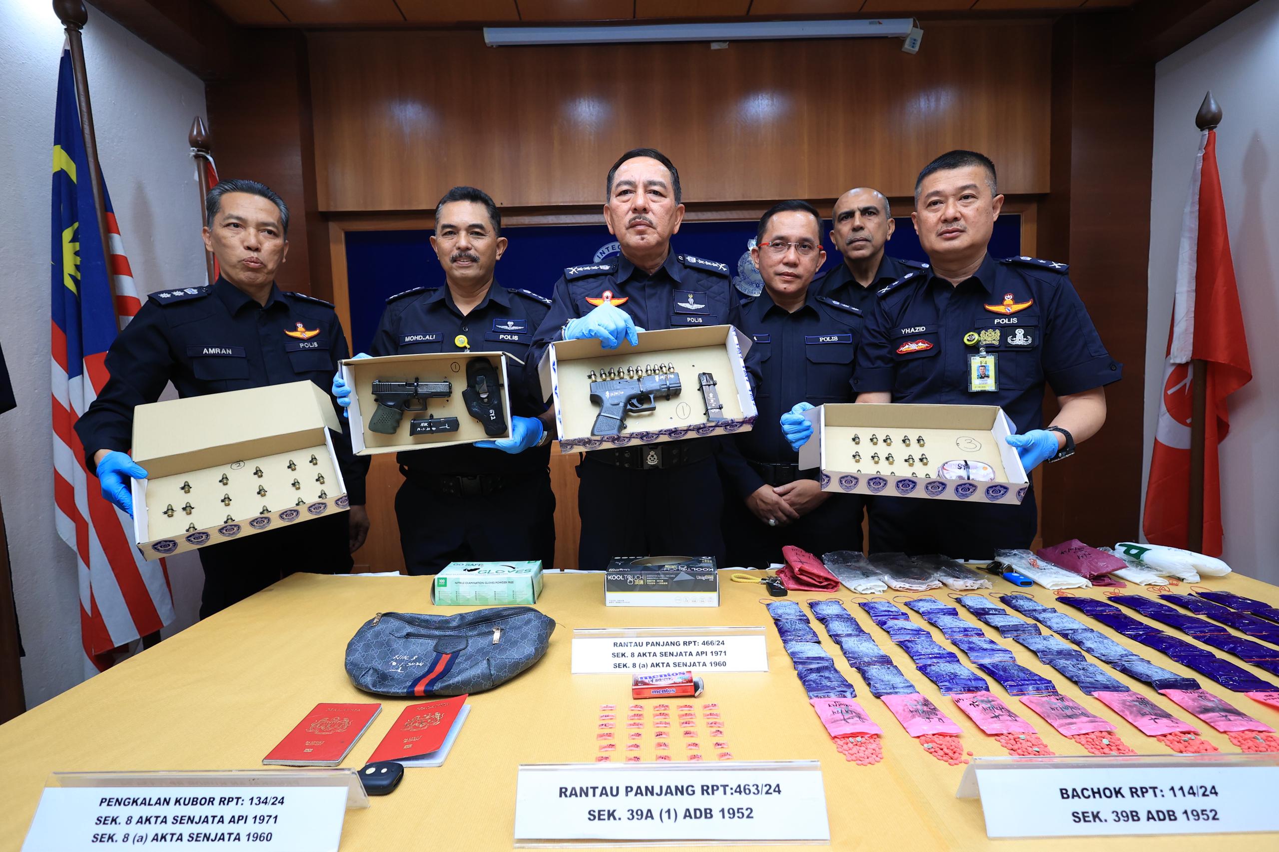 Dalam perkembagan lain, Muhammad Zaki turut berkata, serbuan berasingan polis turut merampas sepucuk pistol jenis Glock dan 31 butir peluru selepas menahan sepasang suami isteri di Kampung Geting, Tengah, Tumpat.